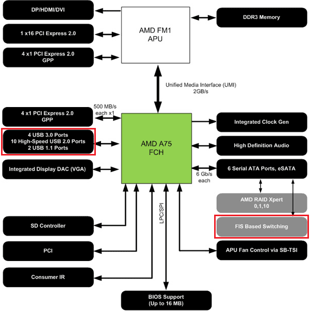 The GIGABYTE A75M-UD2H uses the A75 Hudson and has 2 advantages over its closest brother, the A55 Hudson. These offer FIS-based Switching and Native USB 3.0 support for up to four ports. FIS-based Switching is a built-in SATA port multiplier which allows for simultaneous communications across attached drives and multiple devices on a single port. I don’t expect the latter to be used as 6 SATA III ports (5 headers and 1 on rear IO) is plenty for budget users. This difference is often the reason you need a RAID controller card to take full advantage of a RAID array. The A75 Hudson FCH on the GIGABYTE A75M-UD2H does not need a dedicated RAID card thanks to this feature. This potentially makes the A75 a unique option for something like a NAS or file server.