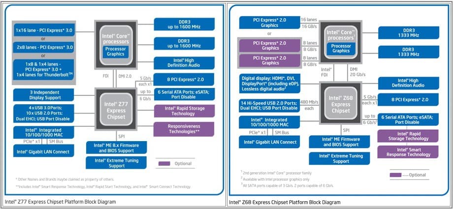 Chipset block diagrams are about the easiest way to compare Z77 and Z68 chipset changes that support Ivy Bridge. Remember, a lot of features are CPU integrated now so many of the features are similar and the diagrams reflect that. The motherboard chipset makes sure the CPU and peripherals communicate properly and efficiently.
