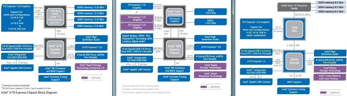 The X79 chipset supports four memory channels compared to X58’s three channels and Z68’s dual channels. X79 offers four more PCIE 3.0 lanes which means no current risk of bandwidth limitations at 40GB/s total. Intel Z68 only had 16 lanes which required the use of PLX chips to remedy the limitation which is a trend started by ASUS. USB 3.0 is still not native to Intel chipsets and requires third party controllers. If you need more than two native SATA3 (6Gb/s) ports, it’s up to board partners to use third party controllers as well.