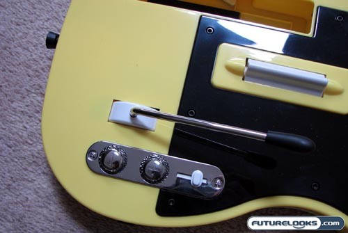 You’ll notice that the + and – buttons have been moved from above the whammy bar to below it for the Nyko Frontman. I have no idea what that white slider next to the + and – buttons are for, because it doesn’t move and doesn’t seem to do anything. I can’t quite put my finger on why, but the Nyko Frontman guitar also feels a grade or two “cheaper” than the real deal. The neck is not detachable either.
