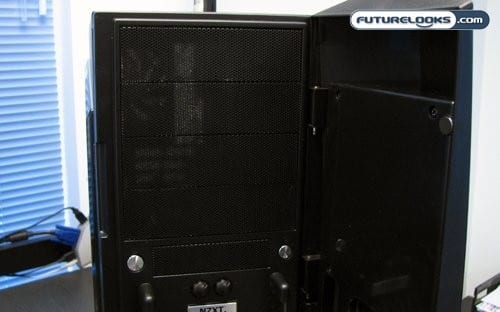 Any particular feature of this case is a good place to start, so we’ll just start with the front. The reduced price of this case comes down to the materials used in construction; a point driven home on the bezel of the LEXA S. Where as the first LEXA was an all aluminum affair, the LEXA S is made of steel with a plastic bezel. That’s not necessarily a bad thing, as the bezel and the door on it are very study and polished to a mirror black finish.