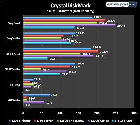 This test bed will compare a SandForce, Indilinx, Toshiba, and Intel controllers. These are all basically the best bang for buck choices available at this particular capacity and price. Keep in mind that the TorqX series has been discontinued and replaced by the Inferno series so we will be able to see if there are any performance differences.