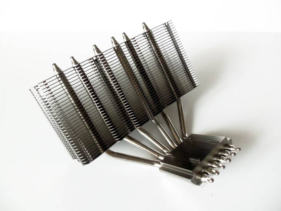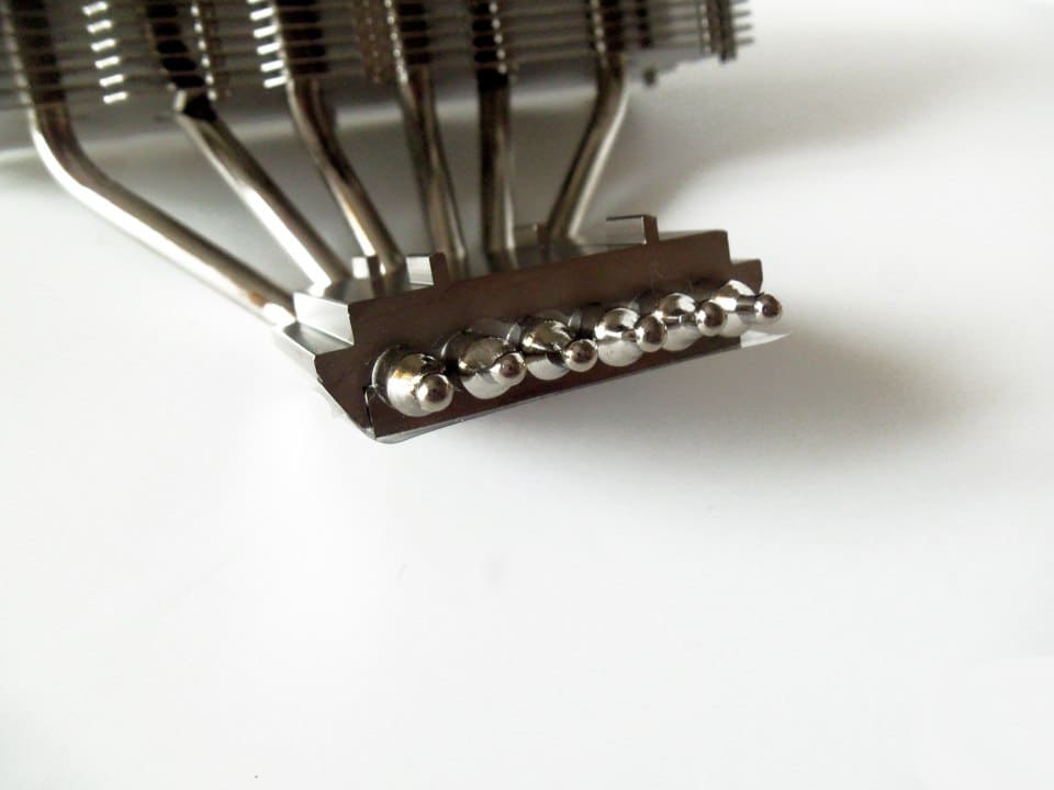 The NT01-PRO has a copper base housed within a rather thick aluminum block. Once installed the base acts as a counter weight to keep the entire assembly balanced through evenly distributed tension across the support frame. Upon closer inspection the block is divided into two pieces and the copper directly contacts the 6 mm heatpipes inside.