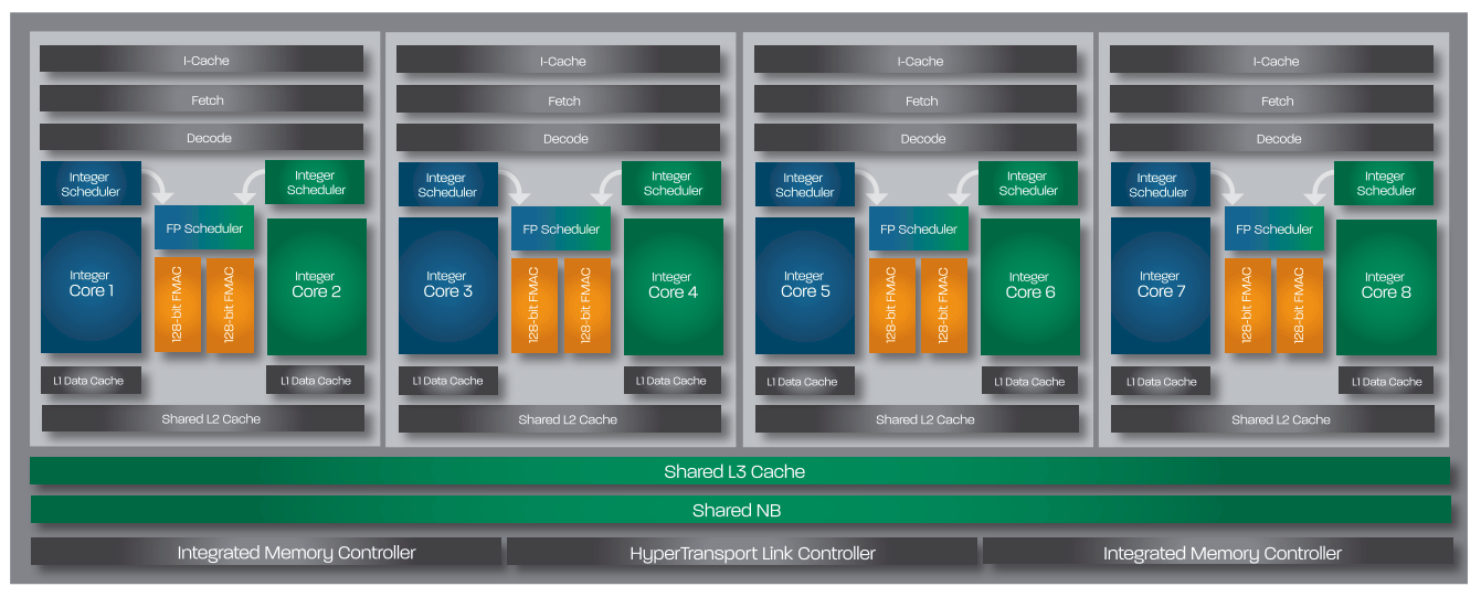 Zambezi, which is the name for all FX series CPUs, all use the Bulldozer architecture. In this unique design AMD has taken two independent CPU cores and combined them into two core modules. These modules will still have a separate integer blocks, L1 caches, schedulers, and with the scheduler connected via 4 pipelines. These two integer cores will share a FP scheduler, 2MB L2 cache, two symmetrical 128-bit FMAC (fused multiply-add capability) floating-point cores, decoder, and fetch block.