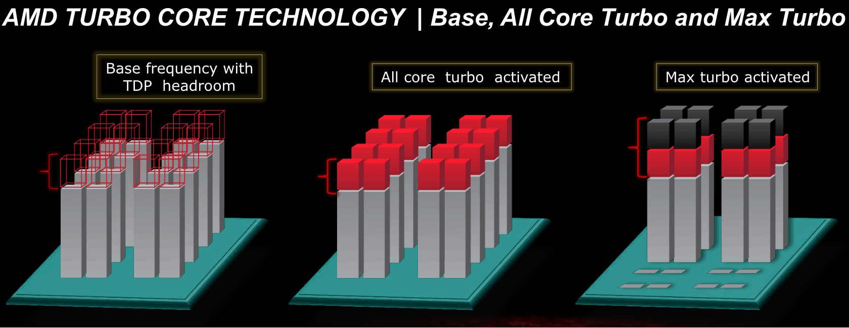The Zambezi chips also sport the new Turbo Core version 2 from AMD. Turbo Core v2 now has 2 boost states. The first boost state is for all eight cores and the second boost state is for only 4 cores. The FX-8150 has a default clock speed of 3.6 GHz, eight core turbo of 3.9 GHz, and 4 core turbo of 4.2 GHz. This means a task that uses 4 or few threads should see four 4.2 GHz cores for this task and allow the other four cores to drop to idle state. This saves power while providing the best performance for low thread count applications.