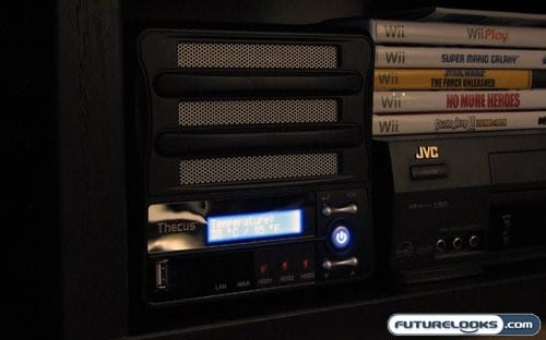 If it isn’t apparent from the picture, I actually have the N3200PRO residing in my home theatre instead of my computer room. This was done as an acknowledgment to what it is I’m intending on using this NAS for; A media server for my HTPC and the rest on my network. This is where my gripe comes in about the power light being way too bright. I would recommend that you set this NAS someplace away from your main viewing area, lest you be overwhelmed by the blue light of the power button. But enough about my poor aesthetic choices; lets see how the N3200PRO actually performs.