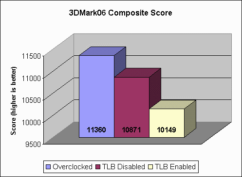 3DMark06 is the latest version of this testing suite, and although synthetic in nature it still provides a fairly consistent scale by which to measure system performance. For our tests we ran the benchmark at default settings to see what numbers we could eke out. In the case of our Phenom 9600 Black Edition we see what is going to be a trend through this review. While overclocked, we only saw a 5% performance increase from our test CPU. As for enabling the TLB erratum fix, when the dust settled that resulted in a 7% perform decrease.