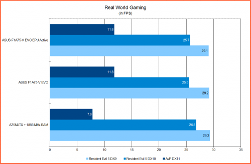 In this test we are going to put the F1 A75-V EVO through its paces with a real world gaming test. As always, the AvP benchmark is done with the default settings with DX11 mode enabled, tessellation on, with high detail at 1920 x 1080. Resident Evil 5 is tested at maxed settings with frame rate unlocked and Vsync disabled with the same screen resolution.