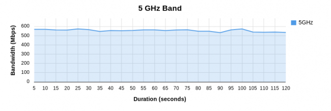 With the laptop tests I make use of iPerf3 and its ability to send data between endpoints. To see the maximum throughput, I send datagrams via UDP over a 120 second (2 minute) period.