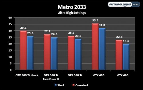 This game is such a resource hog at higher resolutions, it’s not even worth tweaking to reach playable frame rates. Still, the raw GPU power of the Hawk shows the colors of its feathers. If you happen to overclock your CPU a bit, you’ll see frame rates that top the GTX 480 easily.
