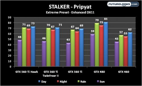 STALKER is a really cool game for benchmarking video cards. The game is so detailed, it uses just about every possible resource inside each of the video cards. Even though we’re using the maximum possible settings, the Hawk (and TwinFrozr II) provide extremely playable frame rates even at stock frequencies.