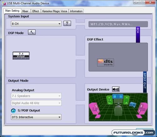 Once everything was setup, I was greeting with a control panel applet that looks remarkably similar to the one shown in our review of the Saitek Cyborg 5.1 gaming headset. The main tab let’s you configure both analogue and digital audio options, and the additional tabs provide mixer and equalizer settings. Strangely there wasn’t any type of speaker test present. Guess we’ll just have to do our own testing.