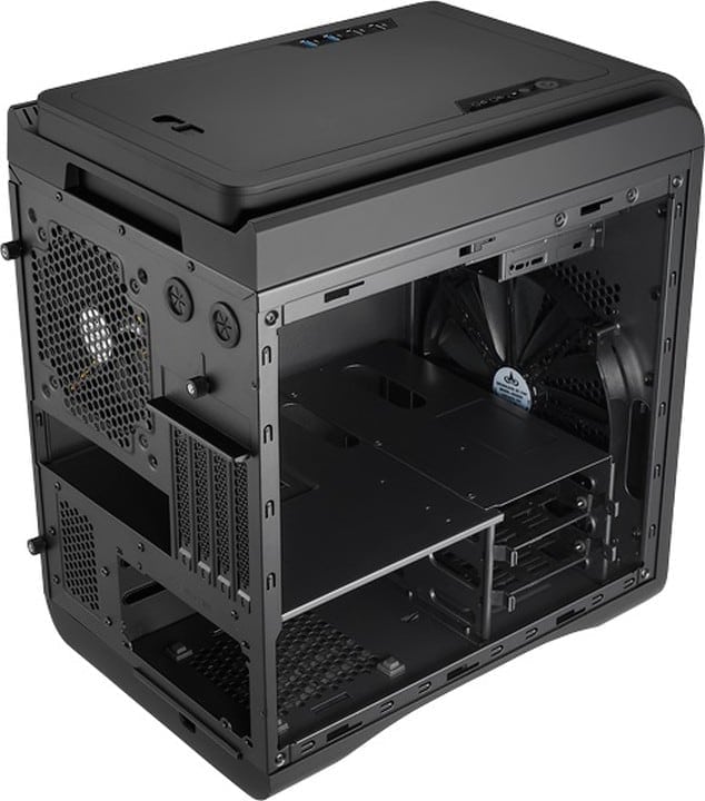 Main compartment is offering much space for the high-end components, such as Mini-ITX and Micro-ATX motherboards, VGA cards with a length of up to 320 mm and CPU coolers with a total height of 190 mm. Unlike most on-market Cube chassis, Aerocool DS-Cube is using the available space more efficient by mounting the motherboard in horizontal direction! Thanks to the removable top-panel, even more arm-room is given for the installation of components, offering unchallenged usability! It is furthermore possible to mount one 240 mm radiator inside the DS-Cube’s top panel, or outside, using the two pre-drilled holes for water-cooling pipes.
