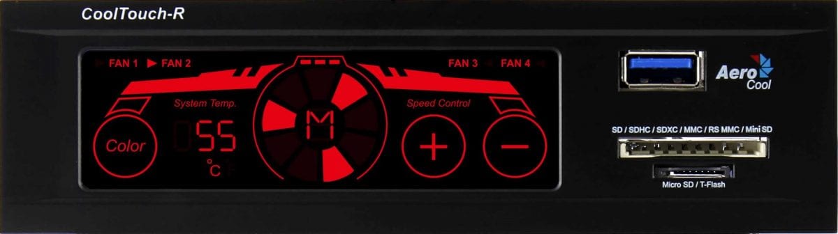 Aerocool CoolTouch-R combines great usability with additional functions and connectivity in a compact single-bay design! It utilizes a slightly smaller 85 x 25 mm LCD display with touch-support and offers additional functions! Besides the four case fan channels, one temperature sensor has been integrated. Hence allows users to monitor the temperature of the CPU Cooler, HDD, Chipset, VGA card or the temperature inside the chassis. The sensor can be placed anywhere inside the PC chassis using the supplied adhesive stickers. Temperatures can be displayed both in Celsius and Fahrenheit. Great connectivity is assured thanks to the built-in card-reader and the USB 3.0 port, located on the right side of the panel. Most common storage media types such as SD/SDHC/SDXC/MMC/RS MMC and miniSD are supported by the card reader.