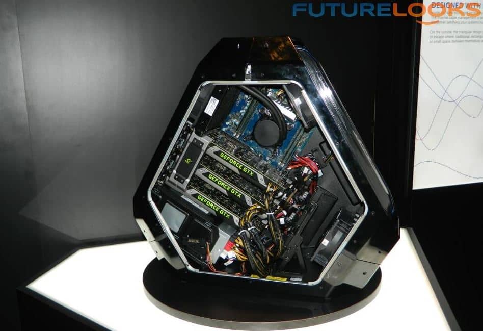 Considering that we’ve got a spherical PC from Zotac and a cylindrical one from Apple, I guess it shouldn’t be all that surprising that Alienware would want to do something different too. You’ll notice that the Area-51 is not a rectangular box, but it rather takes on more of a pointy hexagonal profile that they call “Triad.” Alienware says this allows for better ventilation when you put the unit up against the wall.