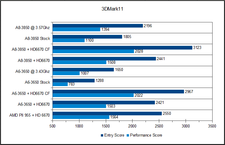 The A8-3850 manages to creep by the Phenom II in OpenGL performance when both are using the GIGABYTE HD 6670 dedicated card. The A8-3850 and A6-3650 both took a very small blow using CrossFireX for this test. According to AMD, OpenGL should only use the GPU the primary display is connected to, which is the on-die GPU in this case. While it is only about 0.5 FPS difference, it shows the small overhead for CrossFireX is still there, even when only one card is in use.