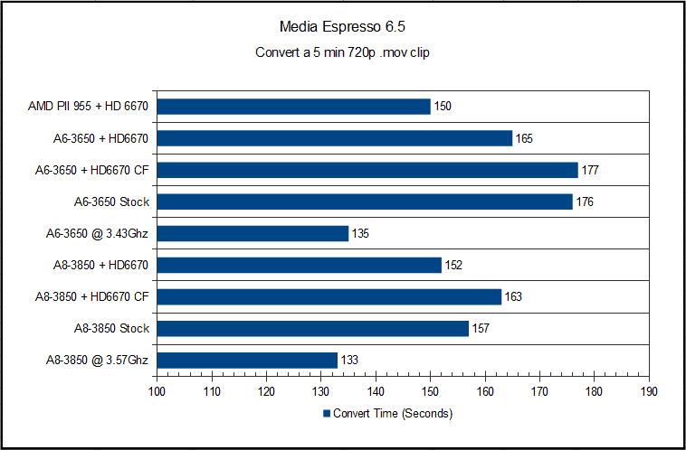 In the Handbrake test I converted a 5 minute 720p .mov H.264 clip using the iPhone4 preset. As with the synthetic tests, real world performance is the same story. The high the clock rate, the faster the encoding is done. It is very clear the CPU side of these APUs are based on the same “Stars” core as the K10 CPUs.