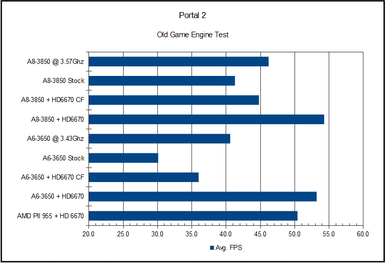 Portal 2 was tested at maxed out settings (8x MSAA, 16 x AF, Vsync ON, Very High Texture). AMD states when CrossFireX is enabled but cannot be used, the system should default to the faster of the two GPUs. This is simply not the case as the CF test are closer to the on-die GPU’s performance. To verify I checked the AMD Resource Monitor. It indicates only the GIGABYTE HD 6670 was at full speed, but the on-die GPU processor was doing most of the work. This could just be an issue with the Resource Monitor.