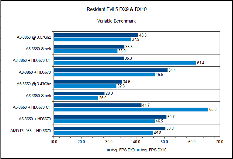 In the Resident Evil 5 DX10 tests I have full use of CrossFireX. Both the A6-3650 and A8-3850 with the GIGABYTE HD 6670 in CrossFireX broke 60 FPS average. A 25% boost in performance over just the HD 6670. In the DX9 tests, CF results were almost identical to the 6550D. It was the CF tests with the 6530D which results in performance closer to the HD 6670. It almost split the difference between the on-die 6530D and the dedicated HD 6670.