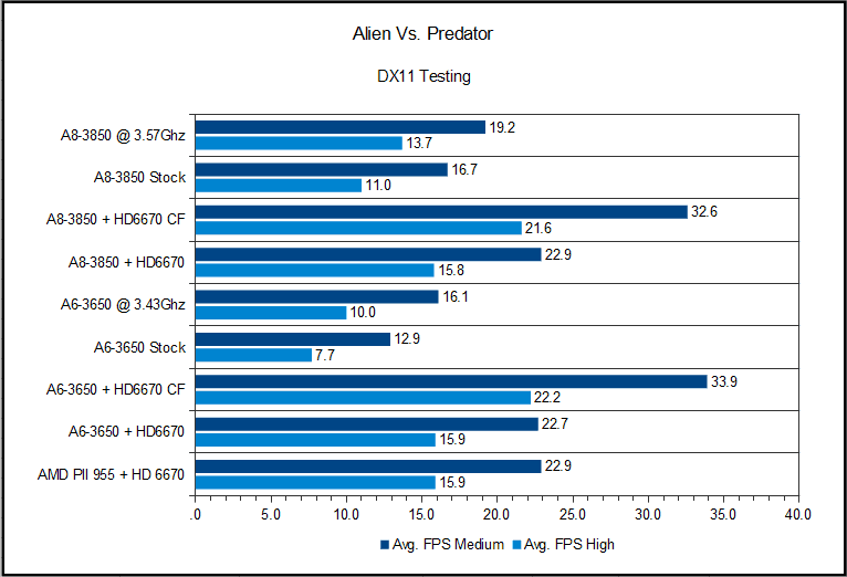AvP was tested with the default of 16x AF, Tessellation on, Advanced Shadows on, and SSAO on. The Medium test was done with all the DX11 features turned off, 2x AF, shadows on medium, and textures on medium.