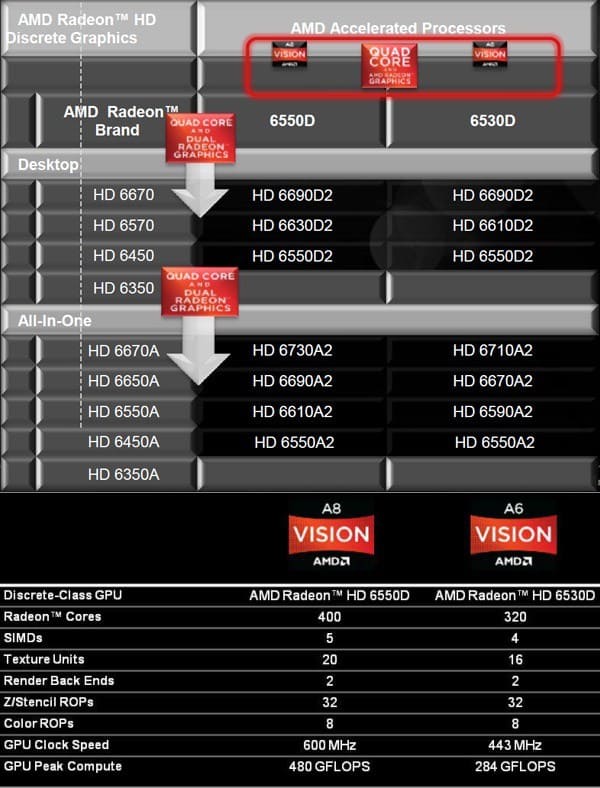 When you compare the “Sumo” GPUs to other offerings from AMD, their name and specs put them between the AMD 6450 and AMD 6570 dedicated cards. The “D” stands for desktop, but is mainly just to distinguish these as not being a dedicated card. Also in the chart you will notice the “Sumo” GPUs can be linked via CrossFireX to dedicated cards in the same performance range. This is a great feature, as those who buy an entry level dedicated card will get more than what they pay for paired up with an A75 board and APU.