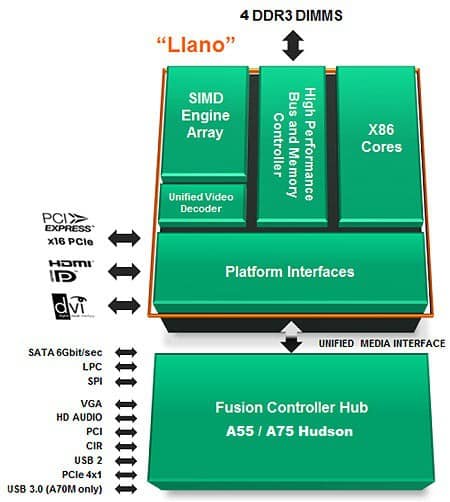 The final task of the on-die northbridge is communication with the southbridge. This comes in the form of a single link from the APU to the Hudson FCH (Fusion Controller Hub). The UMI 2.0 or Unified Media Interface 2.0 is clocked normally at 2.0 GHz and transmits 2 GB/s of data. This is the same bandwidth as a PCIe 2.0 4x link. Now lets take a look at the Hudson FCH which takes the place of a southbridge.