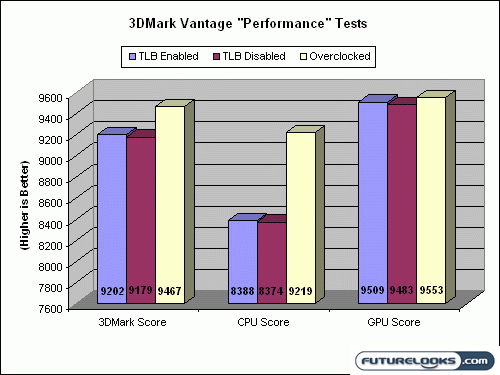 The first benchmark we ran to test these different modes was a quick run through on 3DMark Vantage in Performance mode. Though this latest version of 3DMark is meant to test video cards, it does have a CPU component in it. To test the different environments in which the CPU would operate, I went into the BIOS and made to appropriate changes. OverDrive is a little too flaky for my tastes, and would hard lock the system when I was just changing the TLB mode. Anyhow, I shot for a modest overclock for these tests. I was able to push the Phenom 9850 to 2.8GHz with only having to bump the Vcore to 1.325V. I then hurried up and waited for each test run to complete.