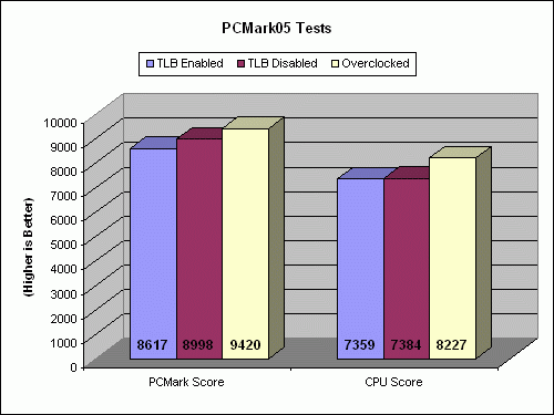 When we switch to the PCMark suite of tests, things get a little more muddled. PCMark05 has a more clear cut definition of CPU performance in its testing, which is the reason we used it. The main composite score generated showed some minor variances, with disabling the TLB fix garnering a minor amount of additional performance over it being enabled. Overclocking the processor of course gave the best performance numbers, with the 300MHz jump in CPU speed producing between a 4% and 9% increase in performance. This doesn’t quite match the 12% jump in speed, but this is just the composite score, and also factors in video card and memory performance.