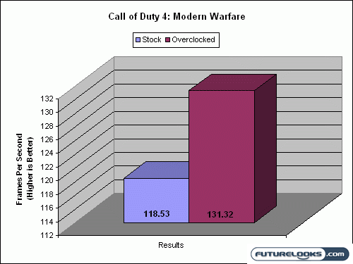 From EP2 I moved on to a 3D shooter I thought would present a much greater challenge to the Phenom 9850. Call of Duty 4: Modern Warfare is a graphically rich game that succeeds in its simplicity, and unlike EA’s attempts it actually works. For testing, we ran through the first part of the first USMC mission and using Fraps recorded the average framerate. This produced some very good numbers. Overclocking the processor produced a 10% increase in performance over stock.