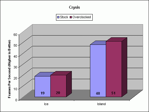 The final game, and the final benchmark, consists of none other then the butcher of performance known as Crysis. For testing we once again turned to the folks HardwareOC, and their benchmarking tools. The Crysis tool comes with separate demos used for testing CPU performance, which go by the names of Ice and Island. Ice is obviously the more punishing of the two, as consists of a timedemo of our technologically enhanced soldier laying waste to a small village using a big gun. With objects flying everywhere and explosions abound, this test puts pressure on the CPU for physics and the GPU for graphics. Island consists of some destruction, and then throws in some wlaking around in the jungle. This makes it less punishing, but still puts a good deal of stress on components.