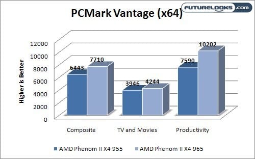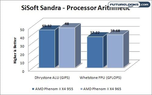 In the Processor Arithmetic test, the Phenom II 965 was 6% faster then the 955 in both the Dhrystone and Whetstone scores posted. This scales perfectly with the 6% speed increase given to the 965.