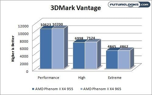 With the exception of the High performance test, there was less then 1% different between the 955 and 965. The High test seems to be an anomaly of averages. Gaming only seems to benefit when there’s new optimizations in a CPU, or a new core altogether. A 200MHz speed increase isn’t going to do it.