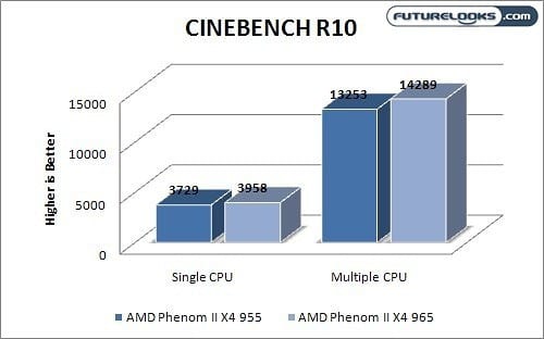 In both these tests the Phenom II X4 965 posted some more levelled scores. The single CPU score was about 6% faster and the multiple core score was about 5.5% faster. The missing half percent when compared to the increase in processor speed could be due to some playing about with the GPU. Still for a CPU using the same core but only 6% faster, these scores are what was expected.