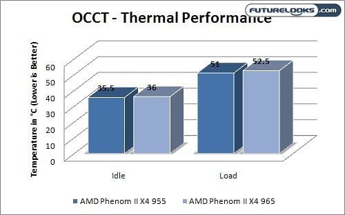 Since we plan on overclocking this CPU, I figured it was good idea to see what kind of thermal performance it has. After all we are working with a high TDP on the Phenom II 965. Turns out that at idle the 955 and 965 are near identical. The 965 is always within a half degree Celsius of the 955. Using OCCT to place 100% load on all four cores I found that the 965 does get a little hotter than the 955, if only a little. We can see a 1.5°C temperature increase in the 965 at full load. So in theory this CPU should have lot’s of room to overclock. I think we should find out.