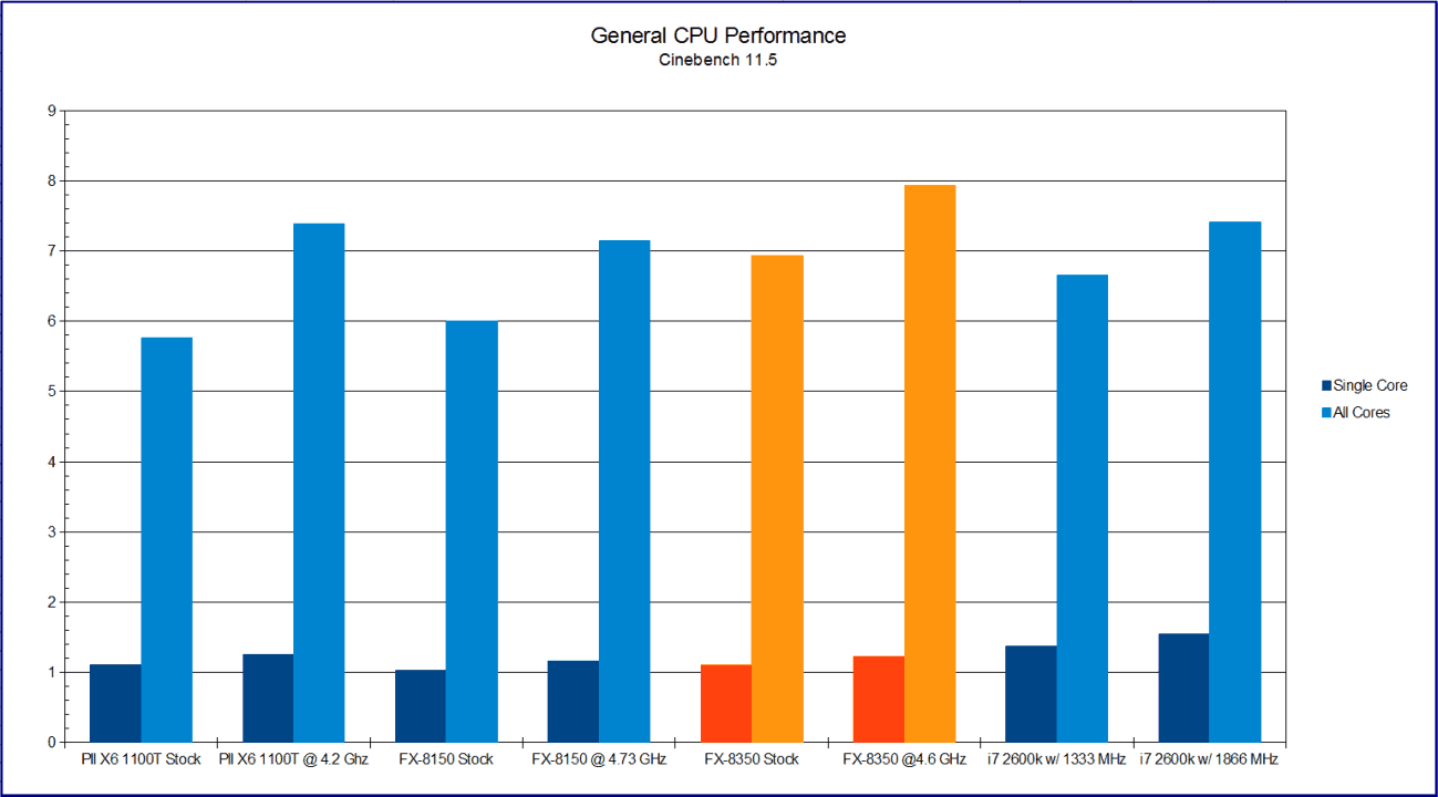 There is some good news and bad news. The Vishera FX-8350 matches single threaded performance of the Phenom II 1100T at 1.11. It is a good sign as the FX-8350 can claim its place as the undisputed champion amongst AMD processors. On the down side, it still falls behind the i7 2600k in single-threaded performance. However, the new Vishera is still much cheaper than the top end INTEL Sandy Bridge parts and even further away in price from the Ivy Bridge parts.