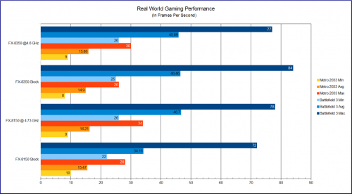 The FX-8350 clearly came out ahead by a 12 FPS average and on max FPS as well. The FX-8150 Zambezi at 4.7 GHz did manage to match the FX-8350 Vishera’s stock performance. I believe this was close to my HD 6850’s performance limit as overclocking the FX-8350 resulted in similar performance at higher clocks speeds.