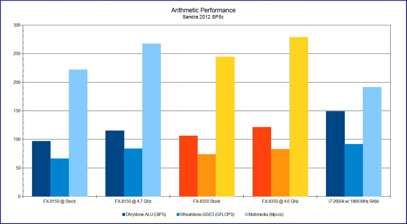 Now lets use more task specific tests to see if the FX-8350 has any weaknesses. The arithmetic tests will show how well Vishera handles Integer math in three different environments.