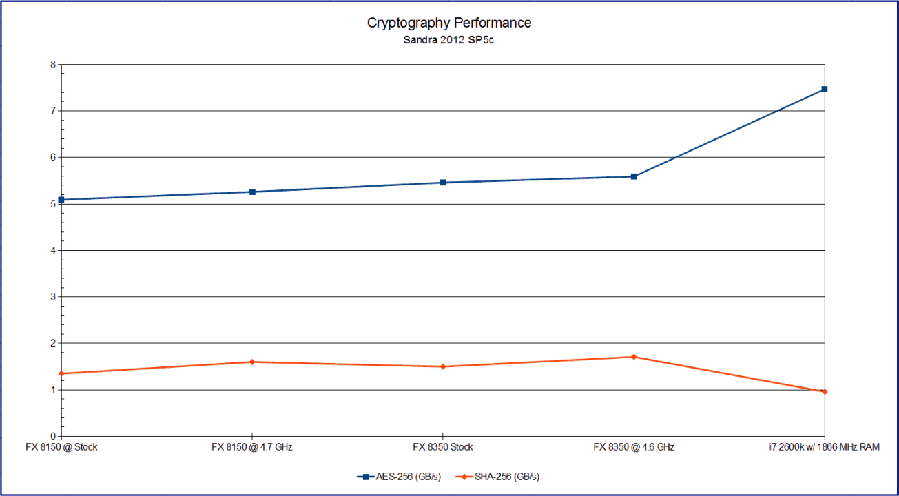 Once again the FX-8350 definitively pull ahead of its predecessor. Even when overclocked to 4.7 GHz, the Zambezi FX-8150 is struggling to compete with the FX-8350 at stock speeds. The Intel i7 2600k takes a firm victory in AES-256, but falls well behind in the SHA-256 testing.