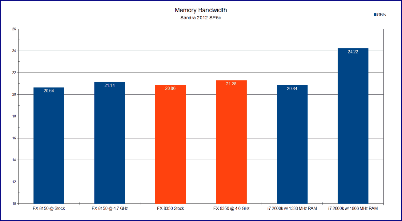 There is unfortunately no major improvement with memory bandwidth over the Bulldozer. This means there is still a 16.6% advantage for the i7 2600k at the same clock speed. This was expected as the memory controller was not listed as being changed or enhanced by AMD in any way.