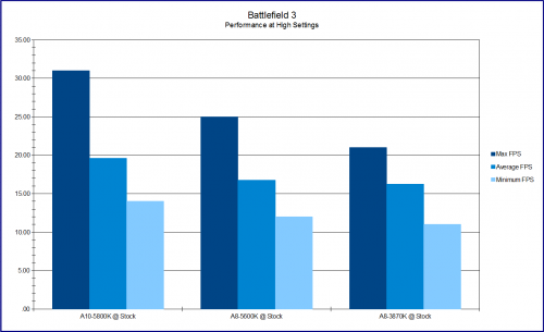 As you might expect, there is no playing BF3 on High with only an APU. It is good to see that the Trinity chips both did better than their predecessor. As foreshadowed by previous tests, the A10-5800K maintains a comfortable lead. If you really insist on trying to play this game with just your an A10-5800K, you will need to set the shared memory to 1 GB or better to stop texture pop-in and use 2133 MHz memory if possible to give memory bandwidth a boost.