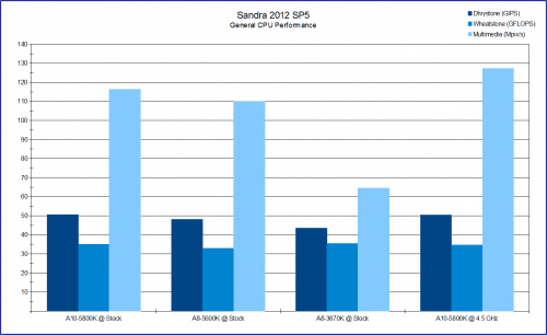 In the arithmetic tests, the new instruction sets make no difference. Here the numbers stay very close with the A10-5800K maintaining that lead. The A8-3870K does manage to take the victory by a small amount in the Whetstone performance. Multimedia testing (how many megapixels the CPU can render in 1 second) is no comparison at all with performance nearly doubled over the A8-3870K with the new Trinity.