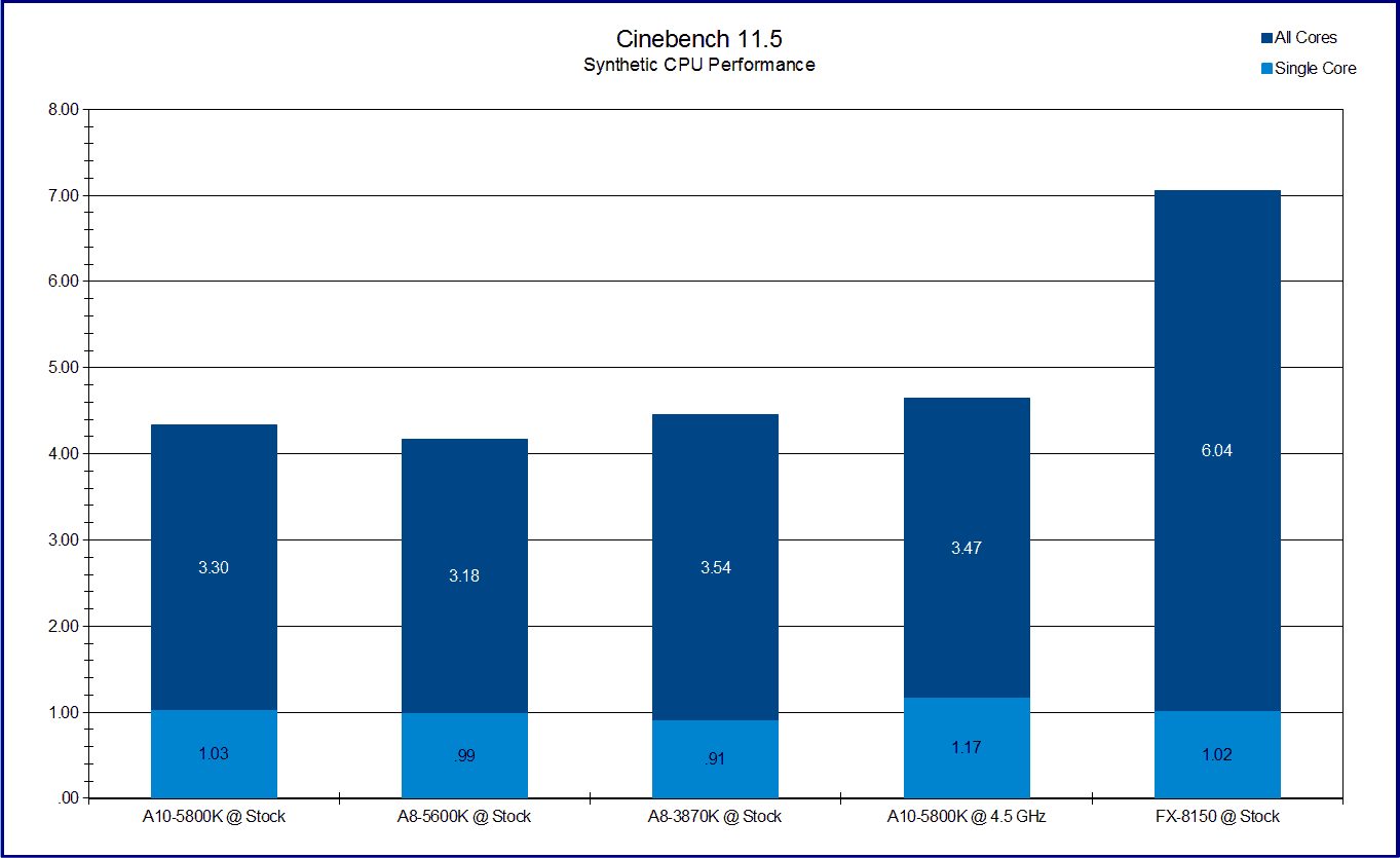 Now that we are clear the on-die 7660D and 7560D are solid performers, lets zoom in on the CPU side of Trinity. Using Cinebench 11.5, we will assess any improvement since Bulldozer. I will be including test results from the FX-8150 in these graphs for comparison.