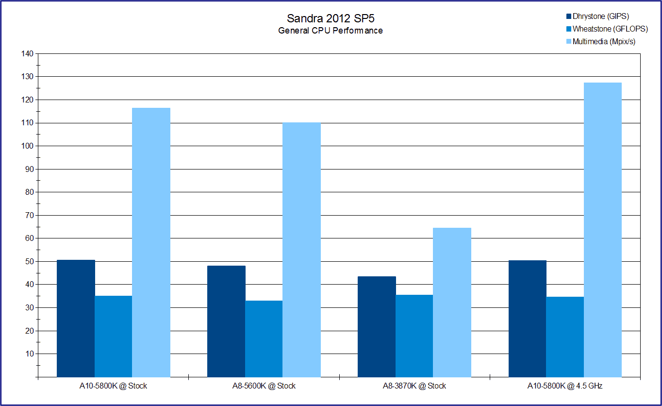 In the arithmetic tests, the new instruction sets make no difference. Here the numbers stay very close with the A10-5800K maintaining that lead. The A8-3870K does manage to take the victory by a small amount in the Whetstone performance. Multimedia testing (how many megapixels the CPU can render in 1 second) is no comparison at all with performance nearly doubled over the A8-3870K with the new Trinity.