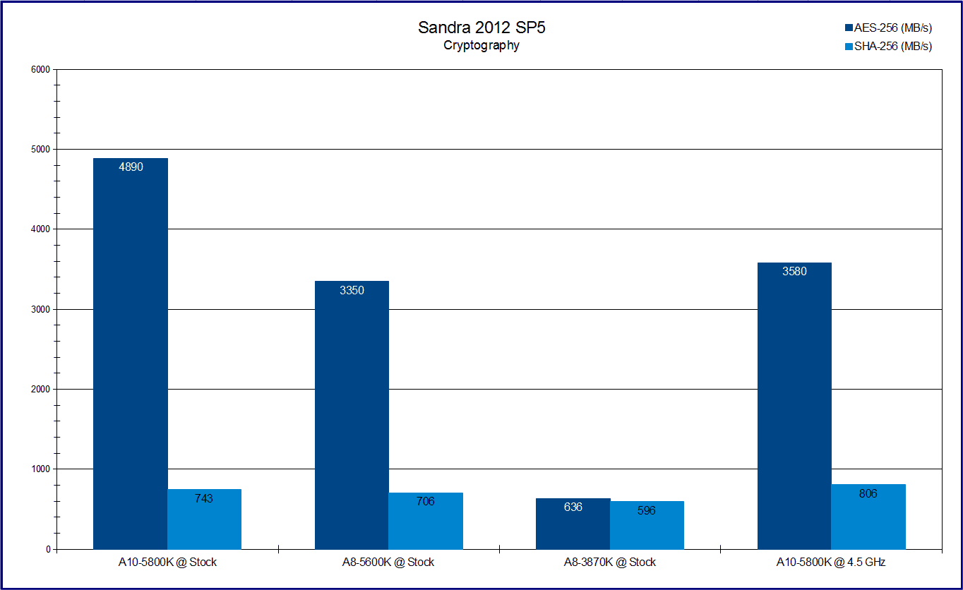 These results came out exactly as expected with the AES-256 testing being completely unfair. In the SHA-256 results we’re happy to see a strong performance from both of the new Trinity chips, but there is a strange drop in performance when overclocked. Overall a good sign for these kinds of tasks and for the upcoming Vishera FX chips which will boast an additional 4 cores for a total of 8 physical cores.