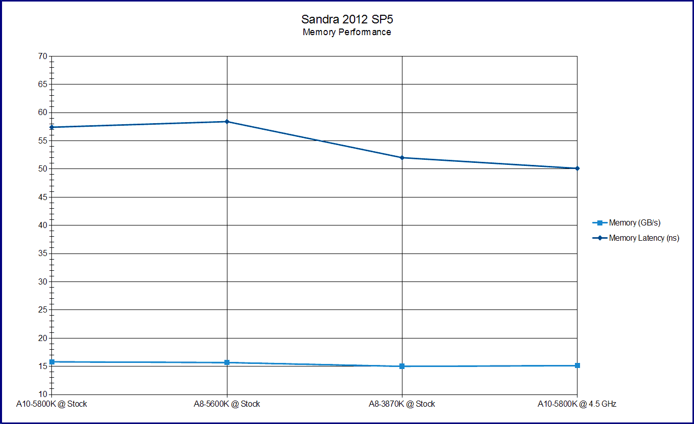 Finally, we have memory performance to look at. Please note, we were unable to run memory at 2133 MHz RAM with the FX-8150 or A8-3870K without system stability issues. The new A10-5800K and A8-5600K can both run with memory at this speed with no issues. Our memory is designed to run at 2133 MHz 9-11-10-28 @ 1.65V by default, but we only used this speed during overclocking tests.