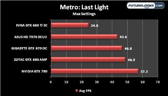 One of our previous benchmarks, Metro 2033, was a GPU crippler on its own. But it’s time to move on so I retired it to try out the latest Metro: Last Light and the details are both amazing and even more taxing on system resources. It’s also a GPU monster so keep that in mind if you have an older video card. You’ll almost definitely need to turn down some settings to run on last generation equipment as shown in the chart. Again, GTX 780 holds up better than the rest.