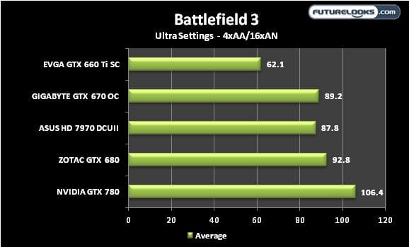 When the brass landed and the smoke cleared, all of the cards are more than capable of running the game maxed out. The GTX 660 Ti has a little trouble when there is a lot of lighting from explosions, flashes, and quick movemnt. 3D mode adds an extra realistic effect which makes you just want to keep going. Ultimately, the GTX 780 is super smooth at all times and there is no noticeable tearing with Adaptive Vsync (AV) enabled. BF3 tears often so AV is your friend.