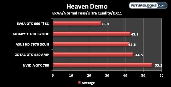 Based on the previous benchmarks, these results aren’t a surprise. The GTX 780 runs very, very smooth throughout the benchmark. Even with Extreme Tessellation, the GTX 780 managed 48 frames while the rest of the pack lost more than 15 frames each with the option enabled.