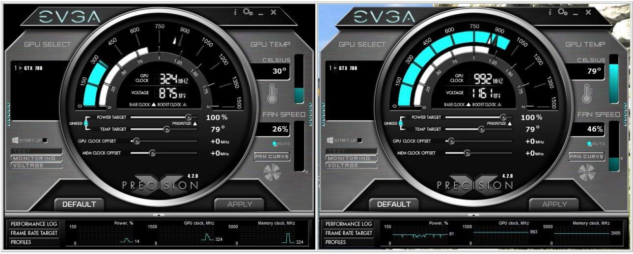 I used the Heaven demo going through three passes recording the operating temps because it’s a good real world indicator of what you can expect in real world conditions of usage. Ambient temp was 20C. At idle, the NVIDIA GTX 780 idled between 28C and 30C versus the ZOTAC GTX 680 AMP at 36C. At full load, the GTX 780 reached 79C versus the 680 at 81C. Keep in mind, that even though the GTX 780 consumed 236 watts that it idled cooler and ran similarly to the hotter 680. To top it off, this is with the GTX 780’s reference cooler which is a very decent performer and quite the looker in our opinion.