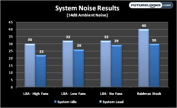 With that in mind, we have average temperatures recorded from having the system stowed in a Raidmax generic case with a single cooling fan. We will compare those temps to the LanBoy Air system with the fans off to give us a baseline and the fans on to reveal any active cooling benefits. At the same time, we’ll be monitoring system noise using a noise level meter, and recording those to see if the extra exposure to the elements will create any annoying effects.